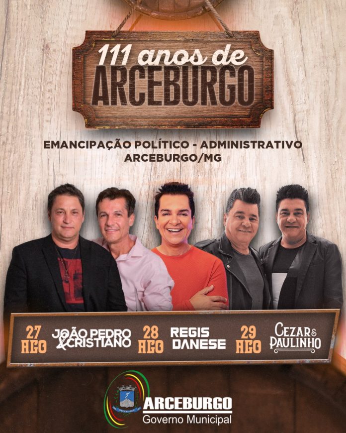 Para marcar o aniversário de 111 anos de emancipação político-administrativa de Arceburgo, celebrado no dia 30 de agosto, a Prefeitura, preparou uma extensa programação de shows. Além dos shows de João Pedro & Cristiano, Regis Danese e Cesar & Paulinho a Prefeitura também é patrocinadora dos shows do ARCEBURGO MOTO ROCK – Encontro de Motociclistas com as Bandas Guns in Roses Cover, Cadillacs Rock Band e Climatic Rock que ocorrerão no Calçadão Municipal Dr Orlando Lodovici, a partir das 10 horas do dia 14 de agosto.