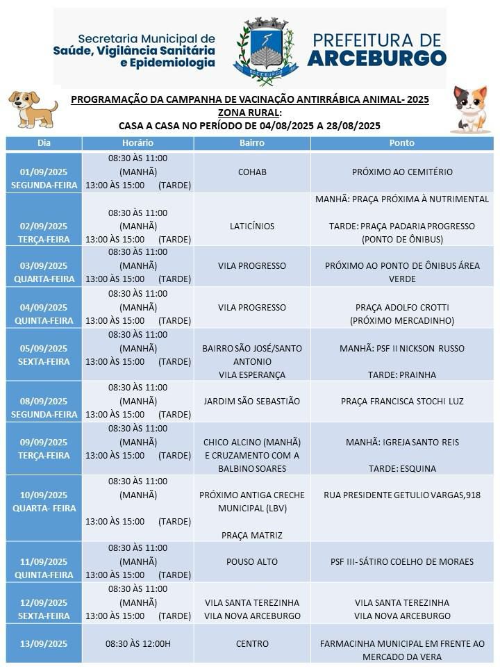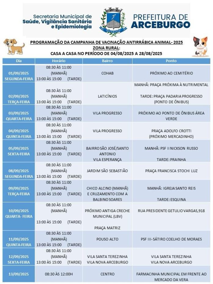 Em setembro, a vacinação antirrábica chega à zona urbana de Arceburgo! 🐶🐱