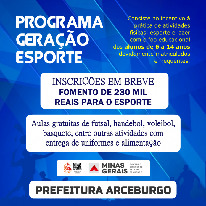 Em parceria com o Governo de Minas, através da Secretaria de Estado de Desenvolvimento Social, SEDESE; a Prefeitura de Arceburgo irá desenvolver o Programa Geração Esportes no município. A iniciativa visa contemplar até 100 estudantes entre 6 e 14 anos no município. Serão ofertadas aulas gratuitas de futsal, handebol, voleibol, basquete, entre outras atividades com entrega de uniformes e alimentação. A iniciativa será vinculada ao Departamento de Esportes do município que fomentará as atividades socioeducativas e esportivas através dos recursos de 230 mil reais repassados pelo Governo de Minas. Os recursos suportarão contratação de profissionais de educação física e aquisição de equipamentos esportivos. O objetivo é o incentivo a prática de atividades físicas, esportes e lazer com foco educacional, por meio de atividades esportivas, paradesportivas e práticas corporais, visando promover o desenvolvimento e inclusão social dos educandos. As aulas serão realizadas no contraturno escolar, 3 (três) vezes por semana. Para participar, é terminantemente necessário que a criança ou adolescente esteja devidamente matriculada em escolas públicas ou comprove bolsa de estudo em escolas particulares