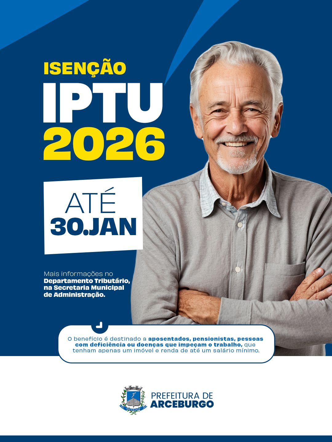 A Prefeitura Municipal informa que está aberto o cadastro e recadastro para isenção do IPTU 2026, com prazo até o dia 30 de janeiro de 2026.
