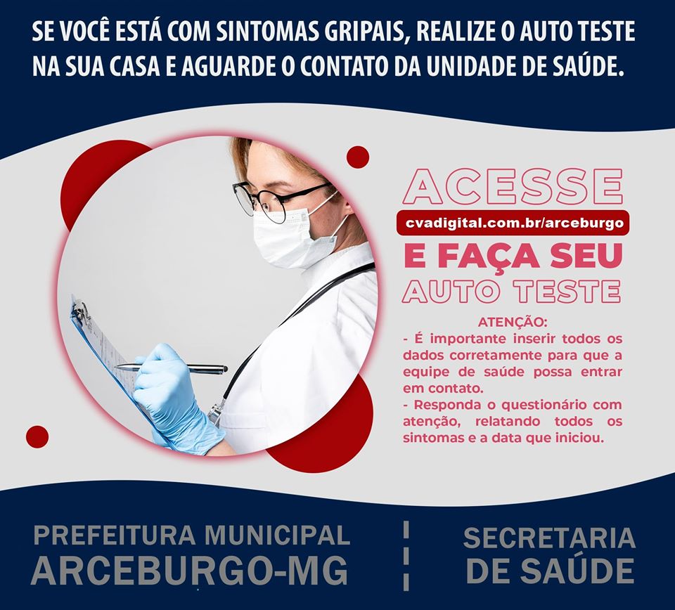 Se você está com sintomas gripais realize o auto teste no site – www.cvadigital.com.br/arceburgo – e aguarde o contato da Unidade Básica de Saúde.