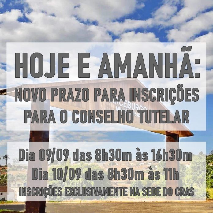 Pode ser uma imagem de ao ar livre e texto que diz "HOJE E AMANHÃ: NOVO PRAZO PARA INSCRIÇÕES PARA O CONSELHO TUTELAR Dia 09/09 das 8h30m às 16h30m Dia 10/09 das 8h30m às 11h INSCRIÇÕES EXCLUSIVAMENTE NA SEDE DO CRAS"