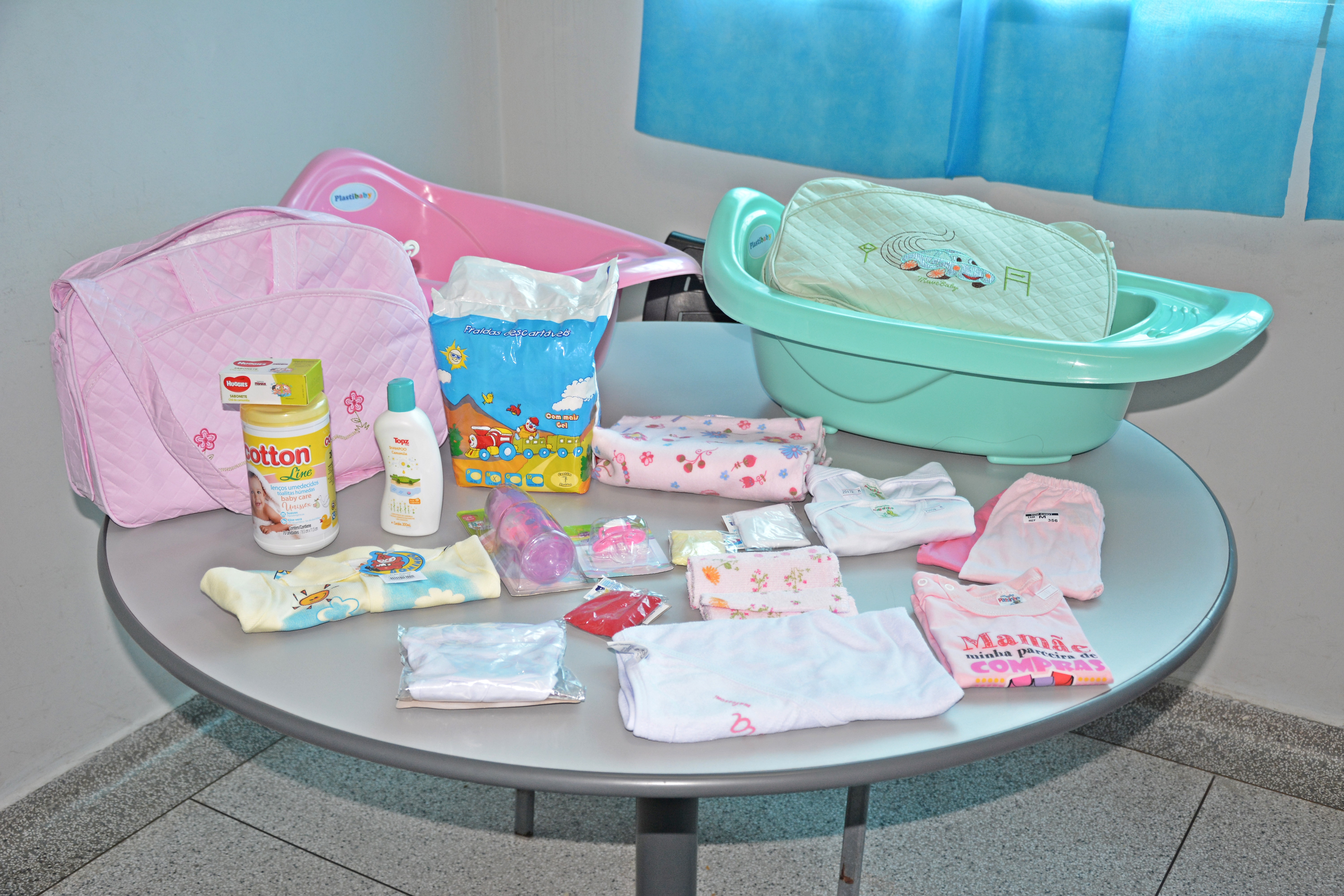 O kit maternidade é uma banheira unissex e uma bolsa de mão contendo diversos itens importantes para o cuidado dos bebês.