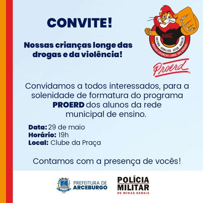 A Prefeitura Municipal, através da Secretaria Municipal de Educação, em parceria com a Polícia Militar, realizará a Formatura do Proerd (Programa Educacional de Resistência às Drogas e à Violência). O objetivo do Proerd é promover a prevenção ao uso de drogas para crianças e adolescentes, numa ação conjunta com a Polícia Militar, as famílias, a comunidade escolar e a sociedade.