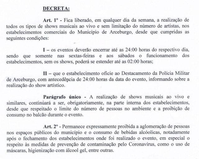 Os shows poderão ser realizados em qualquer dia da semana, desde que sejam encerrados até as 24 horas. Os shows sem qualquer restrição de número de integrantes deverão ocorrer na área interna desses estabelecimentos. Há exigência de comunicação à Polícia Militar, que se entender necessário, possui prerrogativas de exigir mais exigências para realização dos shows. Os bares e restaurantes devem respeitar os limites dos clientes sentados no local, que não haja consumo de bebidas em pé e exigência do uso de máscara em livre trânsito pelo local. Os estabelecimentos continuam obrigados a disponibilizar álcool 70% aos clientes.