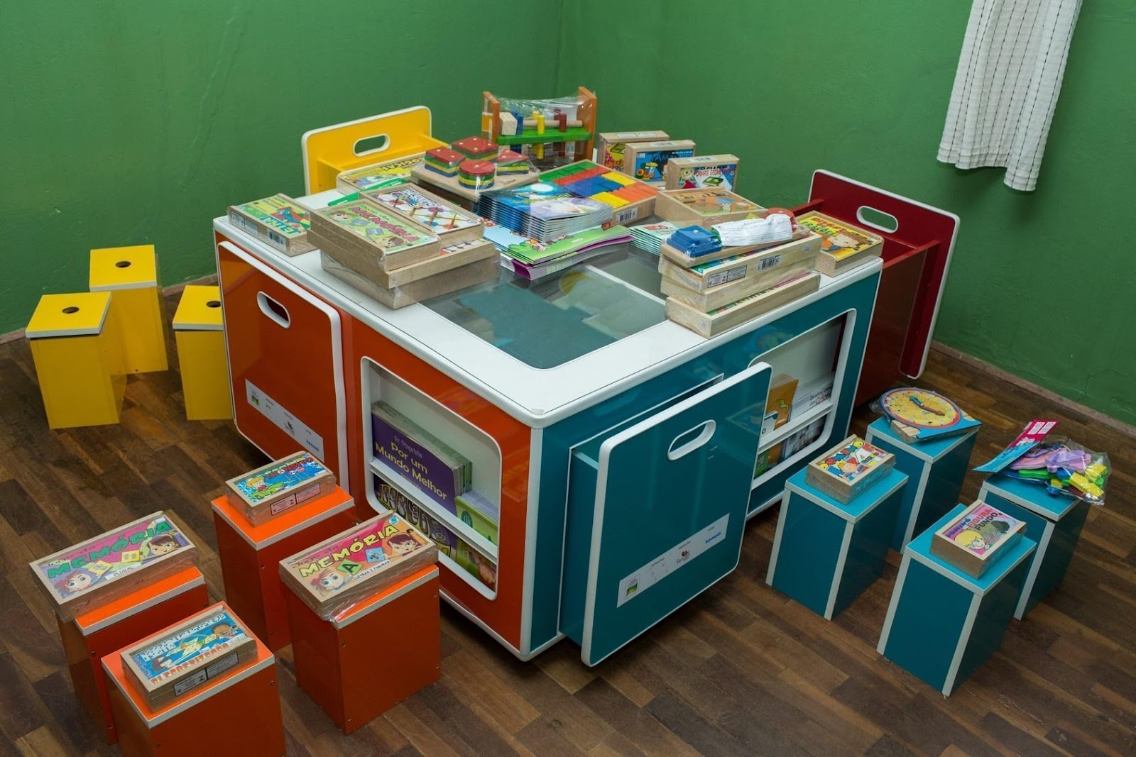 As estruturas têm formato de cubo, com cantos arredondados que garantem a segurança das crianças, contém gavetas para guardar os brinquedos e jogos, e nichos para armazenamento dos livros. Além disso, acompanham 16 banquinhos coloridos para acomodar os pequenos durante as atividades, que podem ser guardados dentro da própria estrutura, ocupando menos espaço e facilitando sua mobilidade.