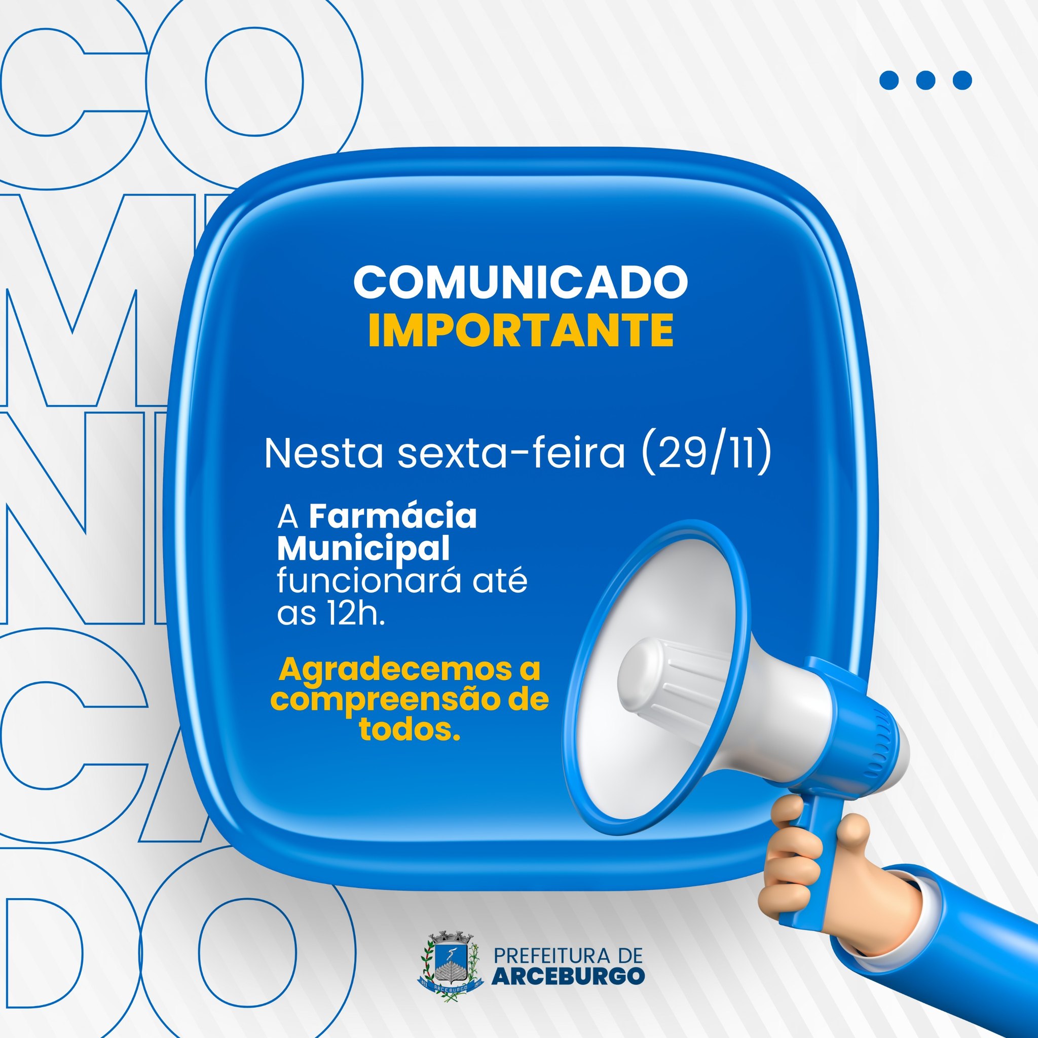 Excepcionalmente nesta sexta-feira (dia 29) a Farmácia Municipal funcionará até as 12h. As razões são as manutenções de pintura que ocorrerão na parte interna e externa do acesso do logradouro público.
